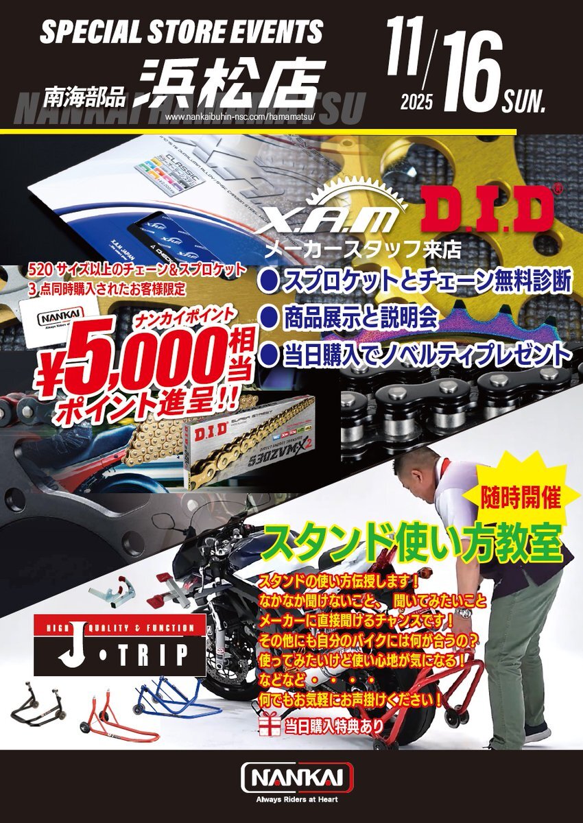#南海部品浜松店 です 15日(土)は #TANAX 16日(日)は #Jトリップ#XAM#DID メーカー来店イベントを開催します。 ご来店お待ちしております。 pic.x.com/NG0yS4CeQv