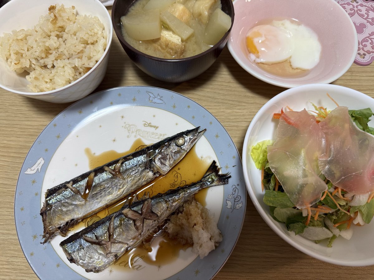 昨日の晩ごはん🍚 旬の秋刀魚と、生ハムサラダとお味噌汁。帆立の炊き込みご飯。ほたては、通販で買ったものを炊き込みご飯にしました(*^^*) それにしても、秋刀魚が美味かった💓 #おうちごはん #秋刀魚 #厚揚げと大根のお味噌汁 pic.x.com/nczjyVIVU4