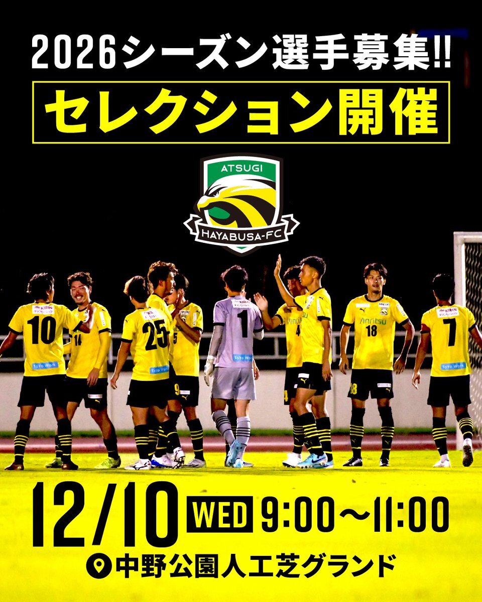 🟨セレクション開催🟨 2026シーズンに向けて新たな戦力となる選手を募集します。 ご参加をお待ちしております🦅 🗓12/10(水)9:00〜11:00 🏟️中野公園人工芝グランド 神奈川県海老名市中野一丁目2314番2 📩エントリー forms.gle/2xvv4Hm5aHh7bS… #厚木はやぶさFC #厚木市#厚木からJリーグへ pic.x.com/pL5ZEhE6iW