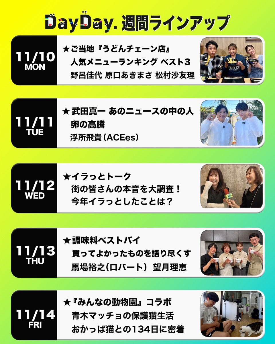 \#DayDay.週間ラインアップ/ ◆(月) ご当地『うどんチェーン店』 人気メニューランキング ベスト3🥇 野呂佳代 原口あきまさ 松村沙友理 @kayopone @haraguchiakimas @sayuringo_staff ◆(火) 武田真一 あのニュースの中の人 卵の高騰🥚 浮所飛貴(#ACEes)@jr_official_X ◆(水) イラっとトーク