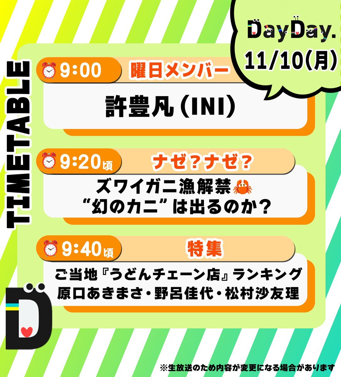 \11/10(月)の #DayDay./ ◆曜日メンバー 🧸許豊凡(フェンファン)#INI @official__INI ◆ナゼ?ナゼ?🤔 ズワイガニ漁解禁! “幻のカニ”は出るのか?🦀 ◆特集 ご当地『うどんチェーン店』ランキング🎖️ #原口あきまさ @haraguchiakimas #野呂佳代 @kayopone #松村沙友理 @sayuringo_staff pic.x.com/EmrRTdcVBL