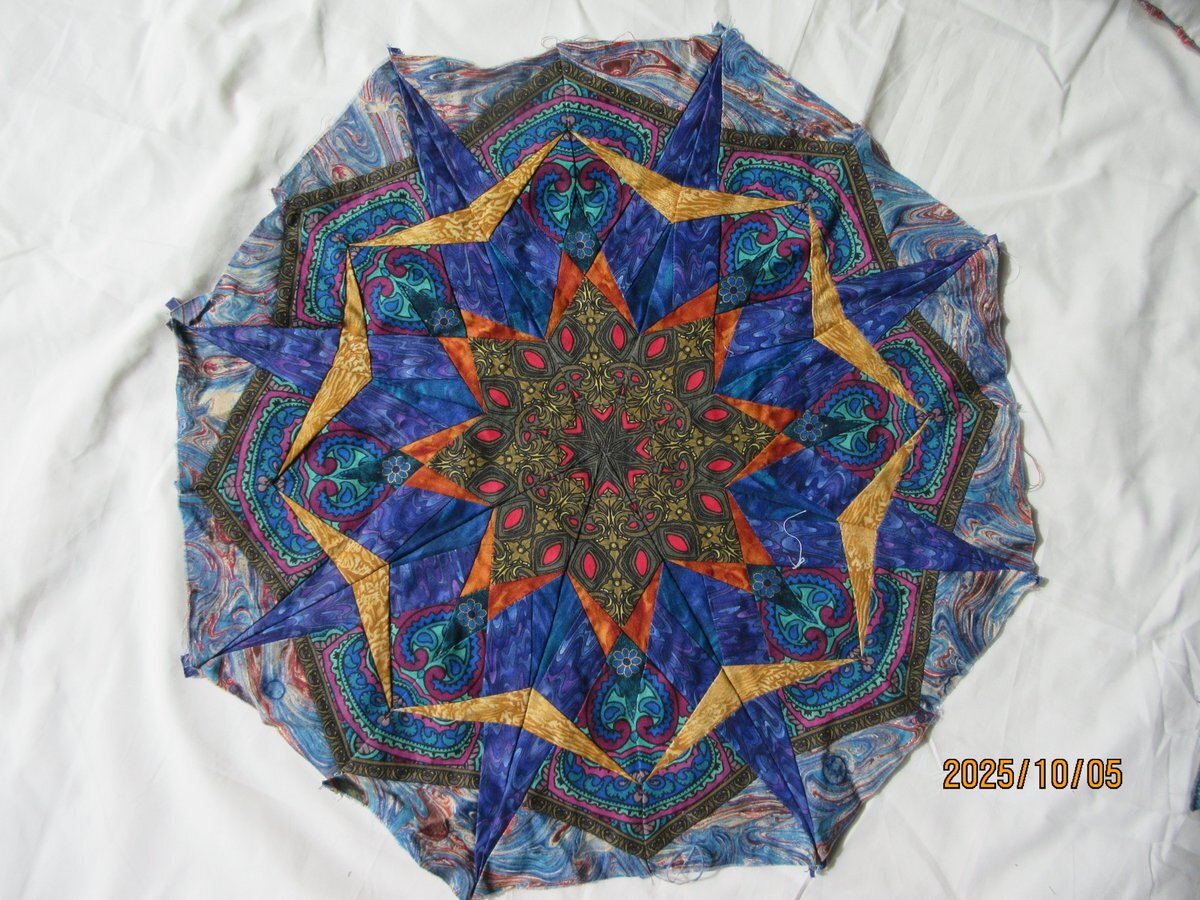 こんばんわ 思い立って片付け始めたらすっかり忘れていた #ピーシング されたパーツいくつか出てきた 多分30年近く前 #万華鏡 題材にして縫い合わせ #断捨離 する気になれずしかし形にする時間は? 探し物出てこず 全く理解不能な総裁選結果 #メガソーラー反対 #原発再稼働反対 #憲法改正反対 pic.x.com/x37CNoP7Jt