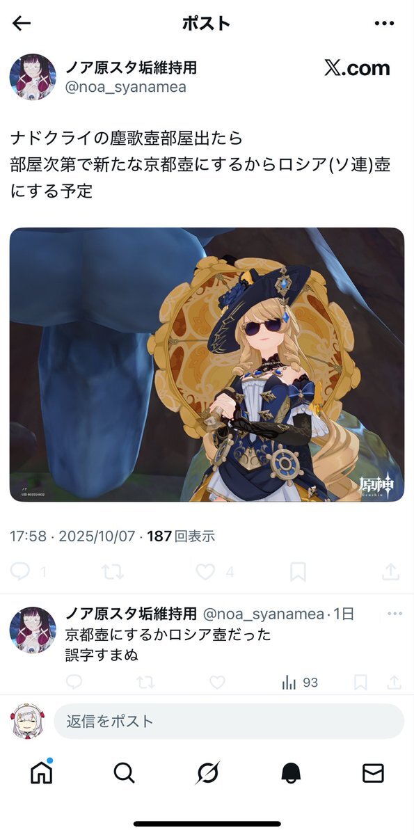 塵歌壺の話してるのに なぜ参政党の話が出てくるのか意味わからん 塵歌壺と参政党の接点無いだろうに あとうちのこと参政党支持者とか言ってるが 詳細なデータとかあんのきゃー? それってあんたの自分勝手な感想だろー? @shiganoe_ #原神 #原神フレンド募集 #原神勢と繋がりたい pic.x.com/jHSUg4Rr73