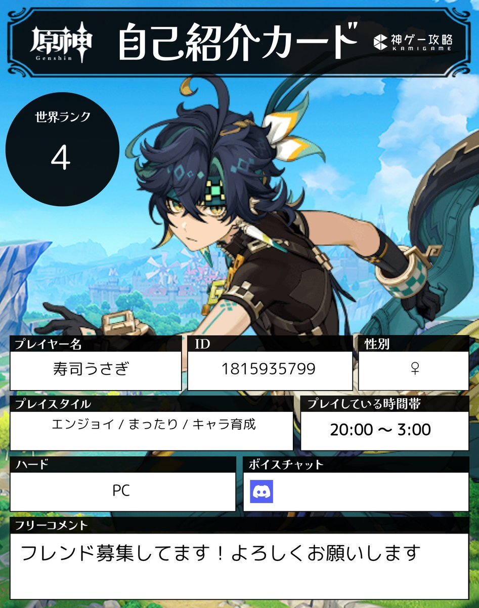 @1 タグ垢シャドウバンのため別垢より失礼致します🙇‍♂️ プロフをお読みの上引用元に反応お願いします(男性の方B) #原神自己紹介カード #原神好きさんと繋がりたい #原神夢女子さんと繋がりたい #雑多垢さんと繋がりたい x.com/___xtg_/status…