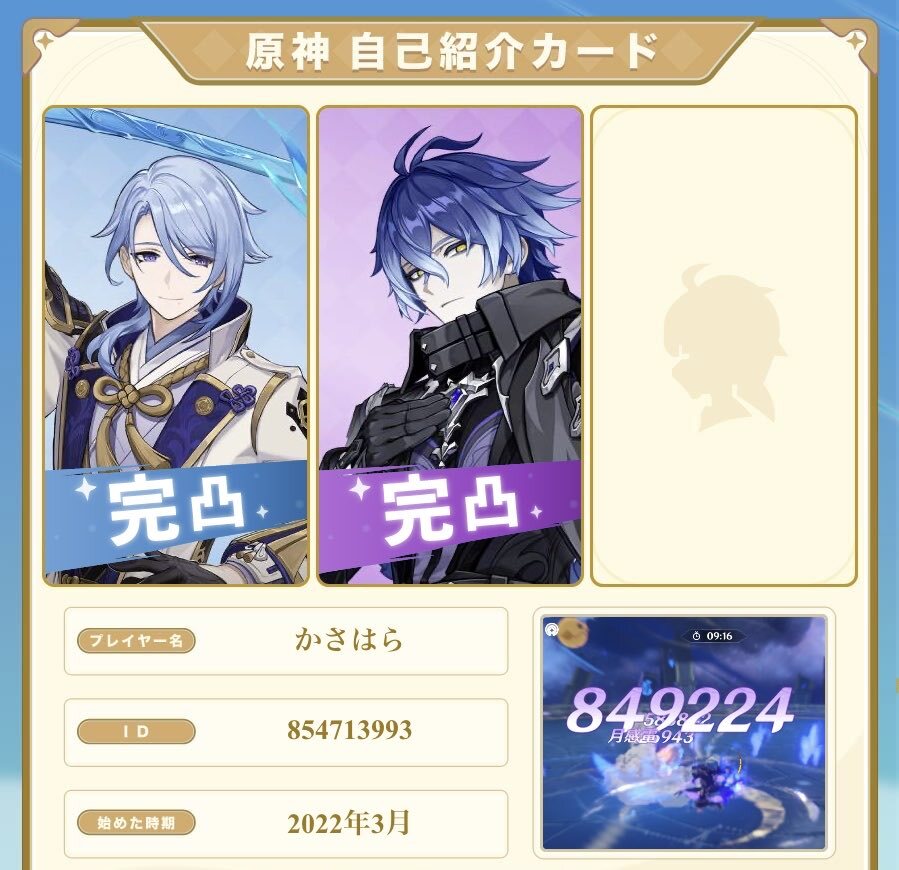 本日やっと完凸出来たので……(死) 綾人、フリンズ完凸です 幻想シアターなどでお使い下さい! フレンド申請⭕️ 絵も描けます #原神自己紹介カード #原神フレンド募集 #原神絵描きさんと繋がりたい pic.x.com/FrQGu8ZS8g