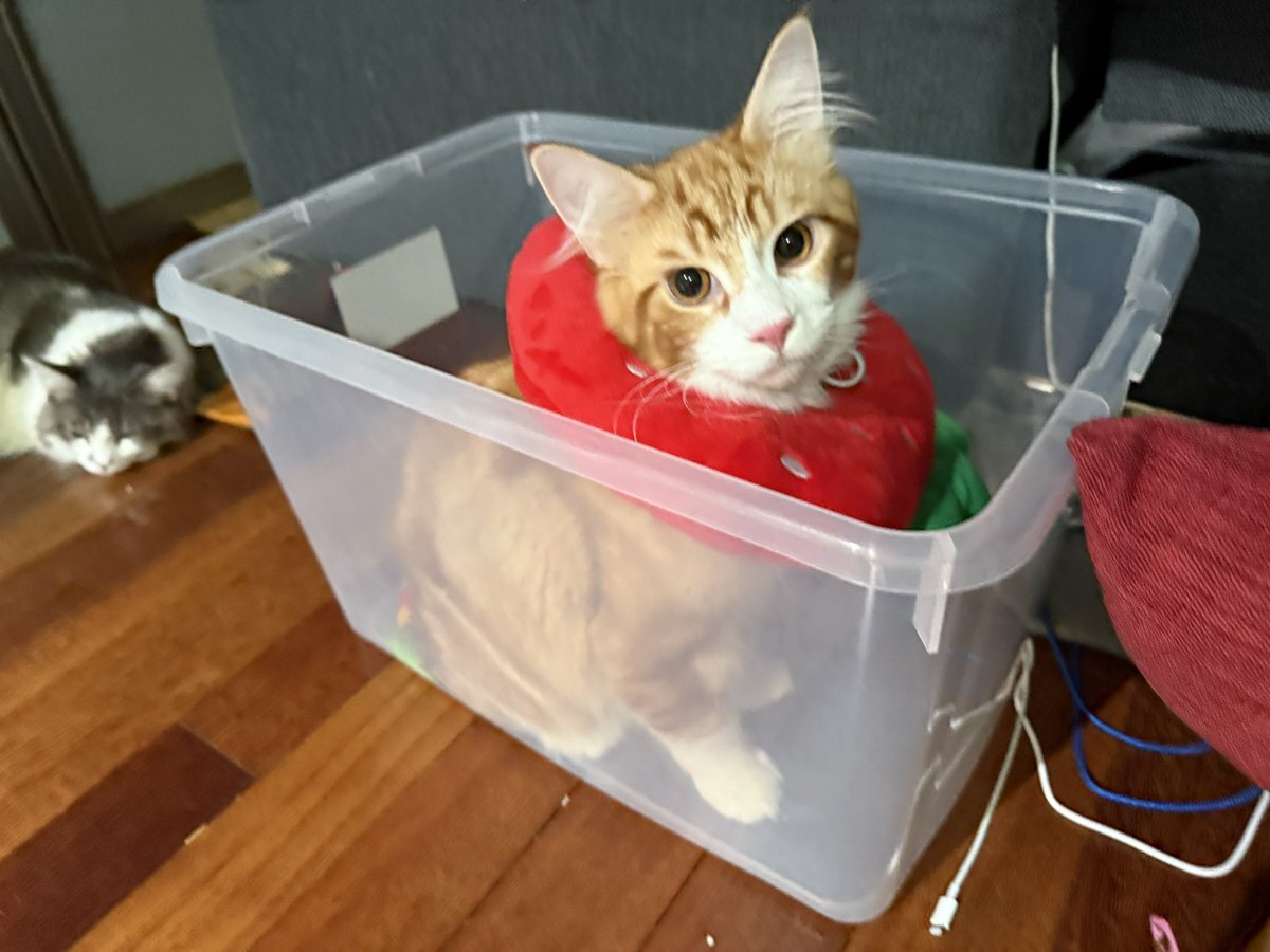 無事帰宅〜 カラーはぶつかって危ないからイチゴに着せ替え🍓 これから1週間いちごと共に #メインクーン #去勢手術 pic.x.com/wZfQqbw74m