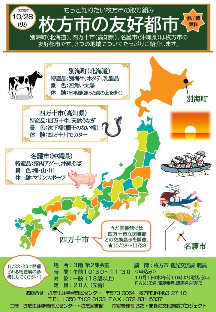 【もっと知りたい枚方市の取り組み 枚方市の友好都市】 友好都市ってなあに?どんなところ? 別海町(北海道)、四万十市(高知県)、名護市(沖縄県)の3つの地域の魅力をたっぷりご紹介✨ 11/22・23に開催される物産展の参考にぜひご参加ください! お申込みはコチラ↓ sada.hirakata-sg.jp/form