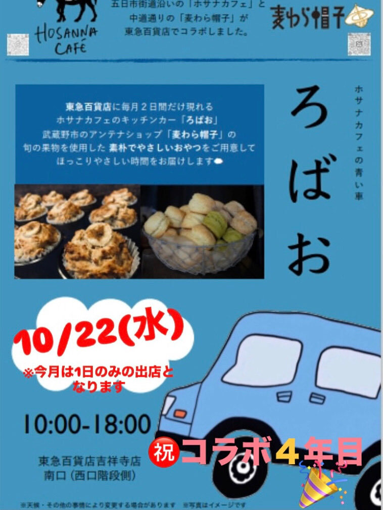 10月の「ホサナカフェ」さんのキッチンカー【ろばお】は 22日(水)です! 東急百貨店吉祥寺店南口(西口階段側)にて 時間:10:00〜18:00 #ホサナカフェ #hosannacafé #キッチンカー #ろばお #コーヒー #焼き菓子 #コラボ #東急百貨店吉祥寺店 #武蔵野市 #友好都市 #アンテナショップ #麦わら帽子 pic.x.com/gvHdIn5jY1