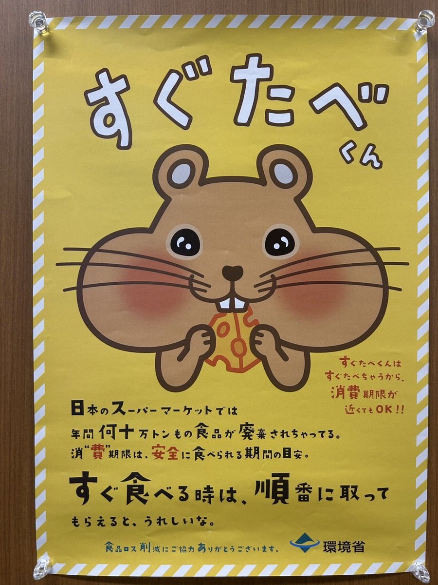 おはようございます! 環境省の政務官室を出てすぐに目に入るのがこの「すぐたべくん」! 毎回、目があってしまって 笑 「すぐたべくん」は、食品ロス削減を呼びかけるためのキャラクター。 賞味期限が近い商品を「すぐ食べる」ことで、食べ物を無駄にせず、環境負担を減らす行動を促します。