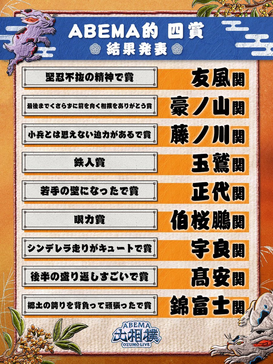 📣ABEMA的 四賞目 視聴者の皆様が考案した賞と賞を贈りたい力士の 一部を抜粋してご紹介📝 ※本投稿でのご紹介は抽選結果とは関係ありません。あらかじめご了承ください。 🔻相撲ロスの皆様、もう一度見るなら、アベマで! abema.go.link/4FUDQ x.com/abema_sumo/sta…