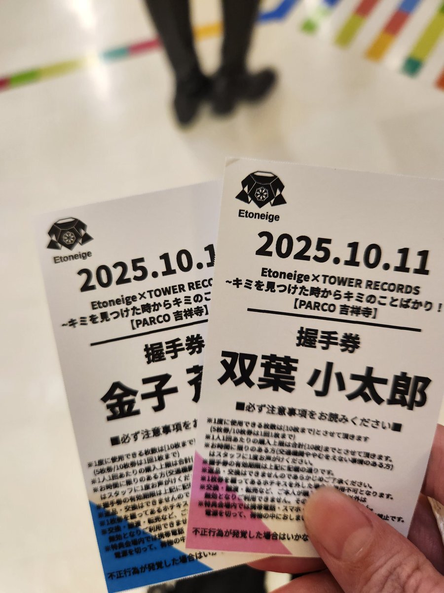 特に言いたい事を考えてなかったんだけど、次行けた時に「Etoneigeを作ってくれてありがとうございます」って言いたい! 旧9bicの最推しと8iperの最推しが混ざった俺得で最強なグループだからね! #Etoneige #双葉小太郎 #エトネタワレコツアー