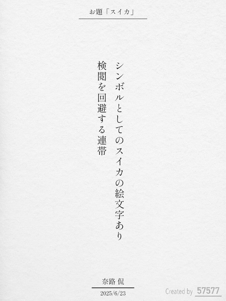 シンボルとしてのスイカの絵文字あり 検閲を回避する連帯 / 奈路 侃 単語で短歌お題『スイカ』 tankaspot.web.app/tankaposts/362… #短歌 #単語で短歌 #短歌アプリ57577 x.com/tango_de_tanka… 🍉 #StopGenocide 🍉