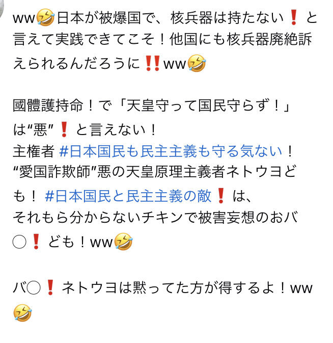返信先:@tanakaseiji15日本が被爆国で、核兵器は持たない❗️と言えて実践できてこそ!他国にも核兵器廃絶訴えられるんだろうに‼️ww🤣 國體護持命!で「天皇守って国民守らず!」は“悪”❗️と言えない! 主権者 #日本国民も民主主義も守る気ない! バ◯❗️ネトウヨは黙ってた方が得するよ!ww🤣 リス3