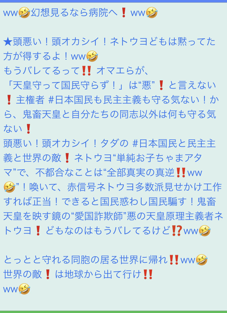 返信先:@togoottoww🤣 #日本国民と民主主義の敵❗️は オマエら「天皇守って国民守らず!」は“悪”❗️と言えない 主権者 #日本国民も民主主義も守る気ない#反民主主義#反日#反社!の “愛国詐欺師”鬼畜天皇を映す鏡のカルト極右(ネトウヨ)“悪”の鬼畜天皇原理主義者❗️ども! #日本国民と民主主義の敵❗️だが‼️wリス3