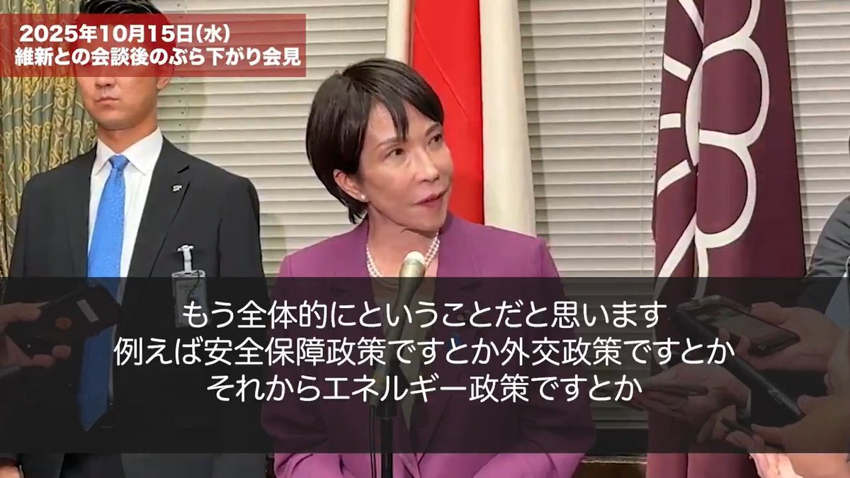 高市早苗総裁 ぶら下がり会見 日本維新の会との党首会談を受けて 【冒頭発言 高市総裁】令和7年10月15日 今日は日本維新の会との党首会談ということで、大阪から吉村代表も上京していただき、藤田共同代表とともに会談いたしました。