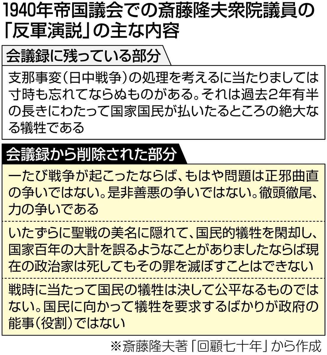 自民「反軍演説」全文復活を検討 日中戦争批判で議事録の大半削除 〈1940年の帝国議会で日中戦争を批判し、議事録から大半が削除されたままとなっている #斎藤隆夫 元衆院議員の「#反軍演説」を巡り〉 〈#自民党 が全文を復活させる方向で検討している〉47news.jp/13227206.html