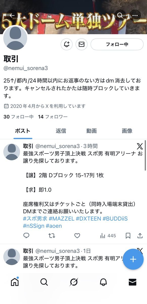 ⚠️注意喚起⚠️ @nemui_sorena3 様とチケット取引を予定していましたが、前日から連絡が途絶え、その後も返信がありません。紙チケットで現地取引の予定でした。 同アカウントとの取引を検討されている方はご注意ください。 #取引 #注意喚起 pic.x.com/plFRfePzS7