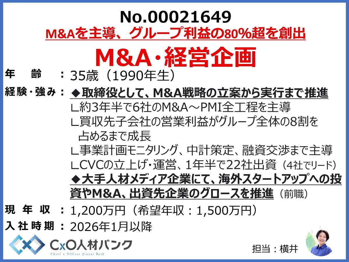 📣上場企業&IPO準備中企業の皆様へ! M&A・経営企画人材、いかがでしょうか?💁‍♀️ 📌 取締役としてM&AとCVCを牽引 📌 6社買収、連結利益8割超までPMIで成長に寄与 ご興味あればプロフィールのリンクから🌟 #CxO人材バンク #経営企画 #取締役 #30代 #転職 @kim_iripoma pic.x.com/eNiYdBcRY6