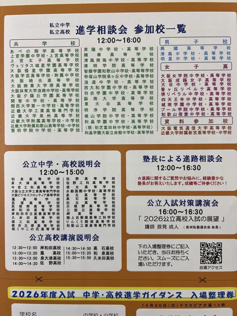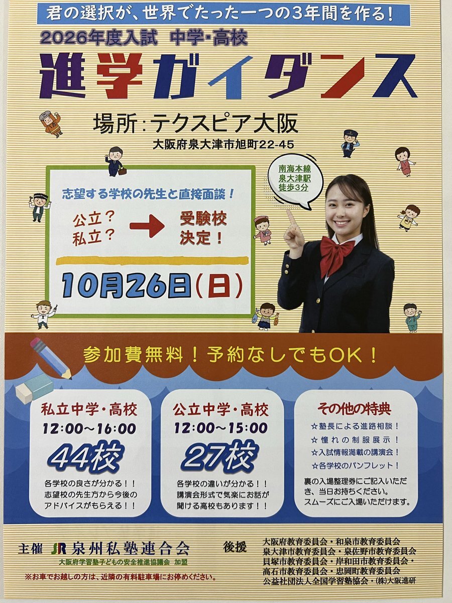大阪府の受験生、集まれ🔥 10/26(日) テクスピア大阪で「進学ガイダンス」開催! 公立?私立?迷ってるなら行くしかない! 先生と直接話して、志望校を決めよう! どうでもいいけど、オレもいてるよ!オレに会えるよ! 参加無料・予約不要💨 #進学ガイダンス #泉州私塾連合会 #受験生応援 pic.x.com/N828rSM96V