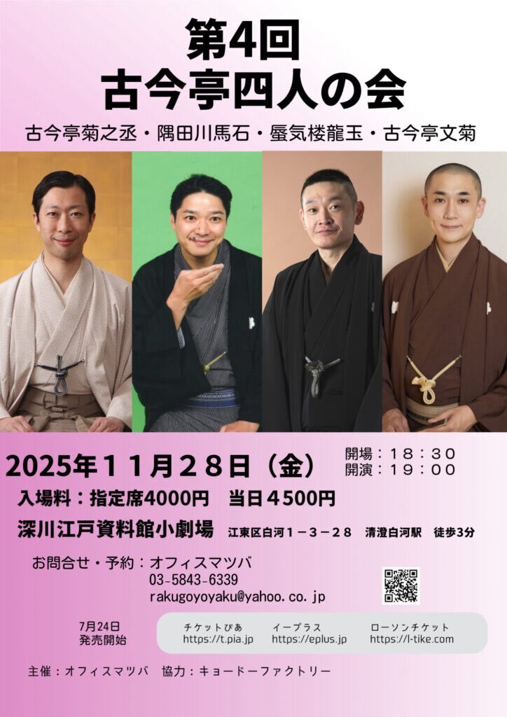 古今亭4人の会 菊之丞・馬石・龍玉・文菊の4人の会です。 チケット残り、あとわずかになっております。 ご予約お待ちしております。 #古今亭菊之丞 #隅田川馬石 #蜃気楼龍玉 #古今亭文菊 #落語会 pic.x.com/rRFArRsNu5