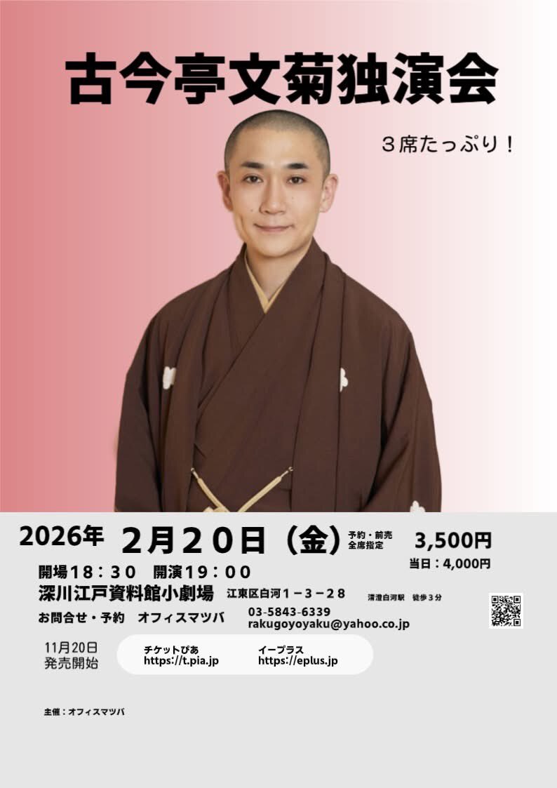 本日より、2月20日開催の古今亭文菊独演会のチケット発売開始いたしました。 たくさんのご予約いただいておりますので、ご希望の方はお早めにご予約ください。 来週11月28日の古今亭四人の会でも販売する予定です。 よろしくお願いいたします。 #古今亭文菊 pic.x.com/BHrmp8KR8h