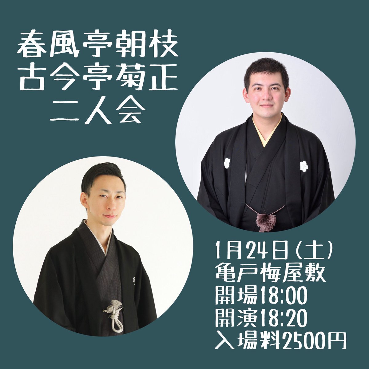 お知らせ 春風亭朝枝古今亭菊正二人会 2026年1月24日(土) 場所亀戸梅屋敷 開場18:00開演18:20 入場料2500円 落語とトークコーナーお楽しみに チケットはPeatixぴあで発売中 予約はdaifukusan1031@gmail.comまで #春風亭朝枝 #古今亭菊正 #落語 pic.x.com/fGfrlhjXjj