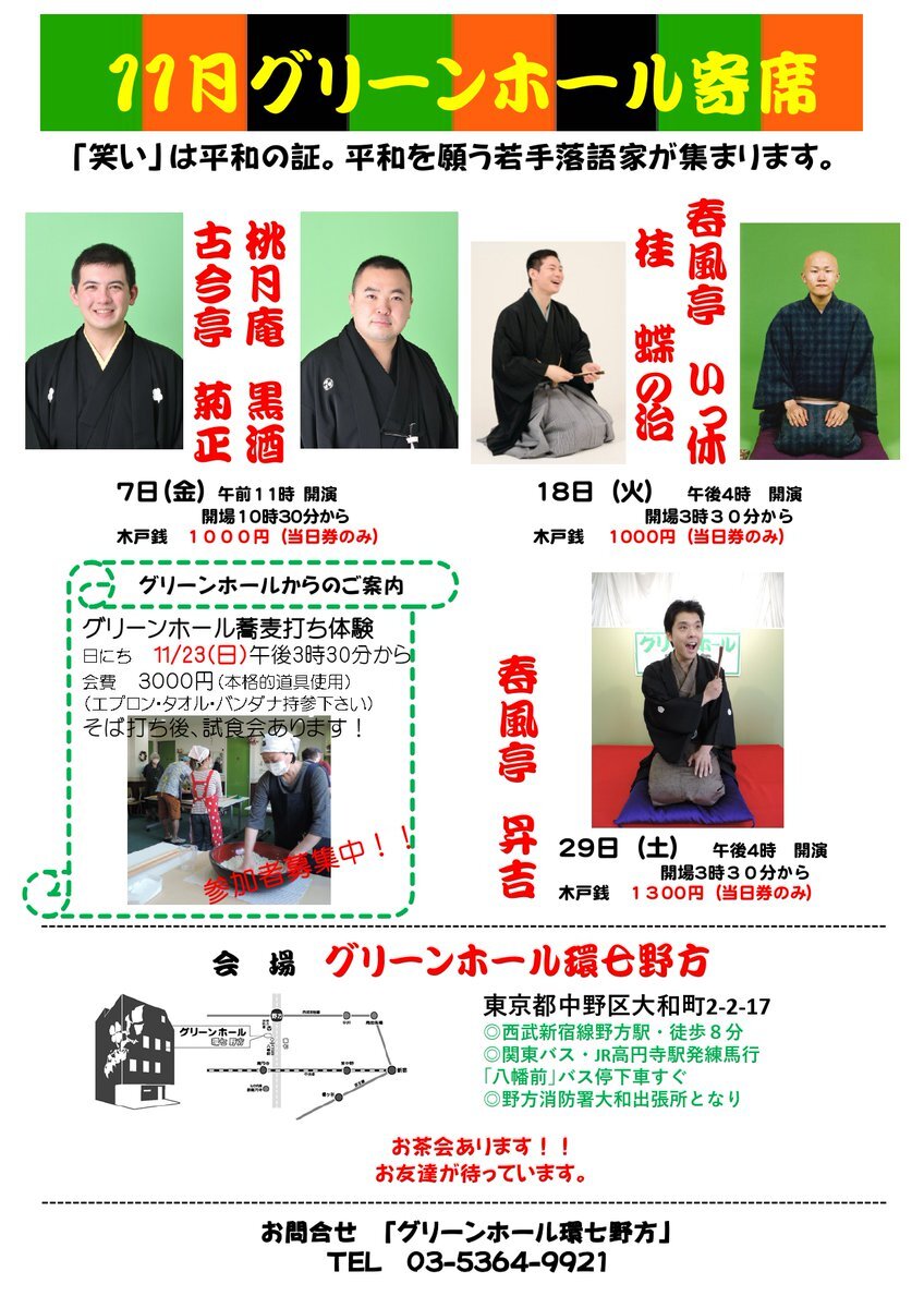 11月のグリーンホール寄席はこちら🍀 皆様ぜひお越しください。 #古今亭菊正 #桃月庵黒酒 #桂蝶の治 #春風亭いっ休 #春風亭昇吉 pic.x.com/aJSfHOCWxc