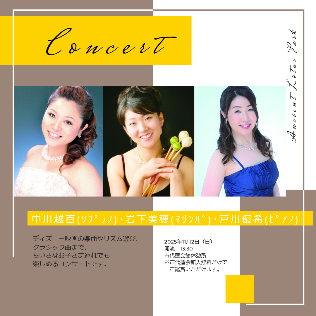 【本日のコンサート】 出演:中川越百さん(ソプラノ)岩下美穂さん(マリンバ)戸川優希さん(ピアノ) 開演 13:30~ 場所 古代蓮会館休憩所 ディズニー映画や「鬼滅の刃」の楽曲など、ちいさなお子さま連れでも楽しめるコンサートです。 ぜひお越しください。 ikiiki-zaidan.or.jp/kodaihasu/even… #古代蓮の里 pic.x.com/jOJyv7cMUD