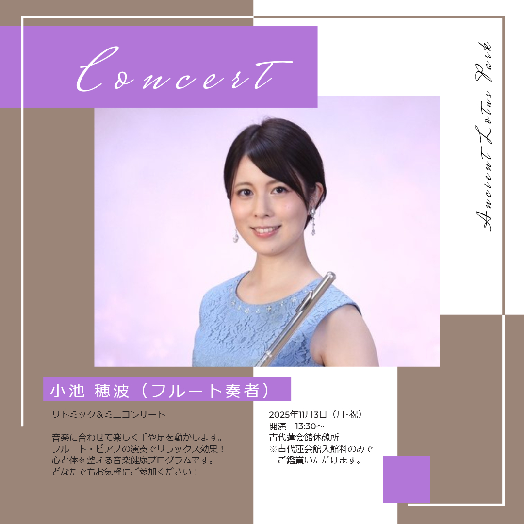 【本日のコンサート】 出演:小池穂波さん(フルート) 開演 13:30~ 場所 古代蓮会館休憩所 リトミック&ミニコンサート 音楽に合わせて楽しく手や足を動かし、フルートの音色でリラックス効果! 心と体と整える音楽健康プログラムです。 ぜひお越しください。 ikiiki-zaidan.or.jp/kodaihasu/even… #古代蓮の里 pic.x.com/lBHwdMDWzV