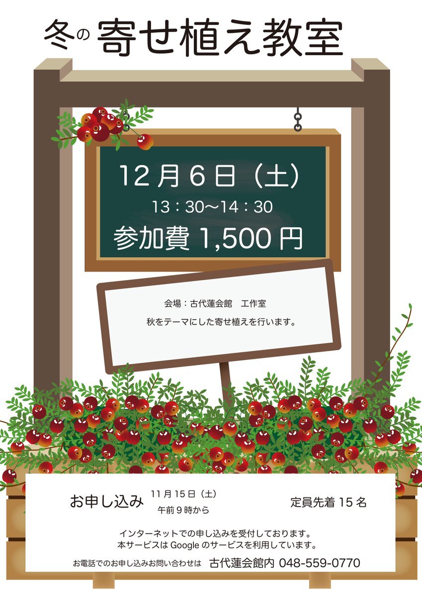 【冬の寄せ植え講座のお知らせ】 日時 2025年12月6日(土)13:30~14:30 冬の植物を生かして、寄せ植えを作ります。 申し込み受付中です。 詳細はHPをご確認ください。 ikiiki-zaidan.or.jp/kodaihasu/even… #行田 #古代蓮の里 #冬の寄せ植え pic.x.com/Eez38Mkkba