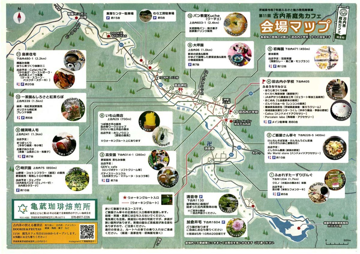 #古内茶庭先カフェ 、いよいよ明日開催! マップの追加情報、体験詳細や変更情報は画像をご参照ください。 なお、大変残念な事に島家住宅に出店予定だったcafeいちごやさんは体調不良につきキャンセルとなりました。あしからずご了承ください🙇 #茨城県城里町 #古内茶 pic.x.com/GbCZi7NXEI