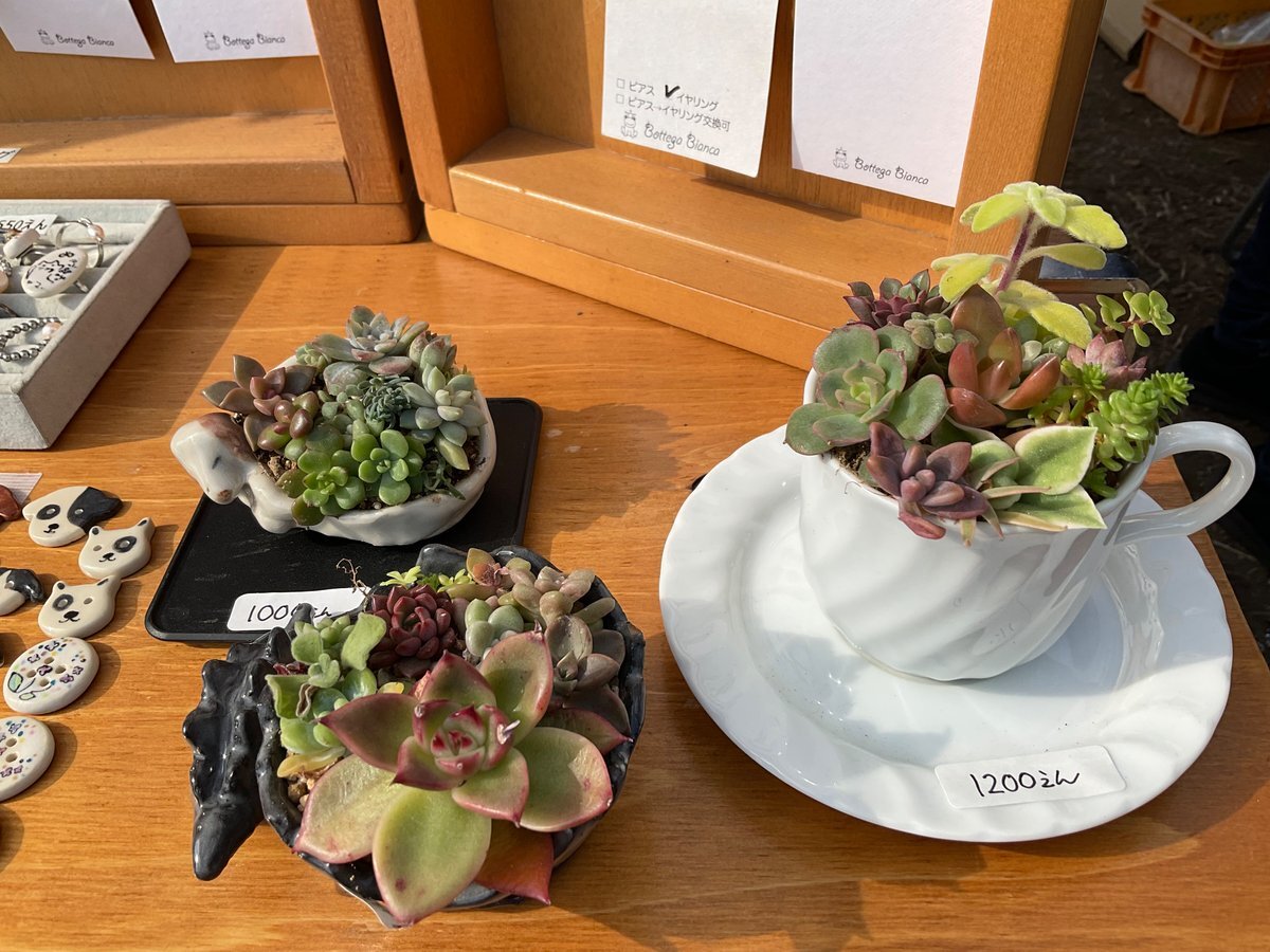 ビアンカさんがポーセンジュエリーラボっていうお名前で出展されていました。得意の寄せ植えはまさかの鉢から作成ですって。あとコットンパールの軽さを教えていただきました。いやこれすごっ。肩凝らない! #城里 #古内茶庭先カフェ pic.x.com/wNLVsyGtUu