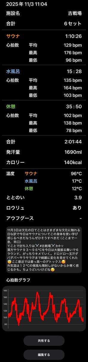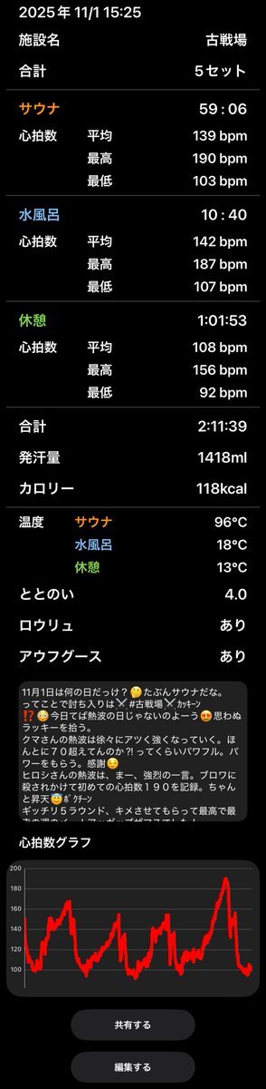 11月1日は何の日だっけ?🤔たぶんサウナだな。 ってことで討ち入りは⚔️#古戦場⚔️カッキーン ⁉️😳今日てば熱波の日じゃないのよーう😍思わぬラッキーを拾う。 クマさんの熱波は徐々にアツく強くなっていく。ほんとに70超えてんのか⁈ってくらいパワフル。パワーをもらう。感謝😌 pic.x.com/dRVtNkJAK9