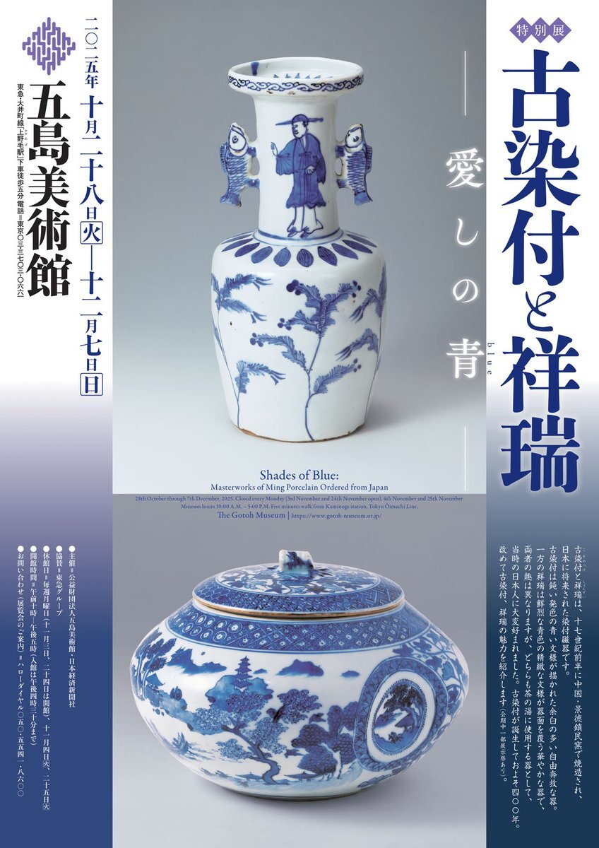 五島美術館では特別展「古染付と祥瑞ー愛しの青(blue)ー」が始まりました。 当館からは古染付張甲牛香合、古染付葡萄棚水指、古染付桜川水指、古染付輪花三足鉢、染付漢詩茶碗、祥瑞二段捻鉢の6点を出品しています。~12月7日(日)。 #五島美術館 #野村美術館 #古染付 #祥瑞 #愛しの青 pic.x.com/K3OZIrxuLr
