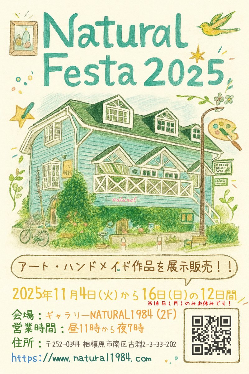 今日から始まる展覧会のご案内です! #ナチュラルフェスタ2025 2025.11/4(火)~16(日) *10(月)定休日 11:00-19:00 #ギャラリーNATURAL1984 #相模原市 南区 #古淵 2-3-33-202 natural1984.com 19名の作家による、多種多様なジャンル・表現のグループ展です。 #haruhi_nakamura pic.x.com/k0UgKs3Mfa