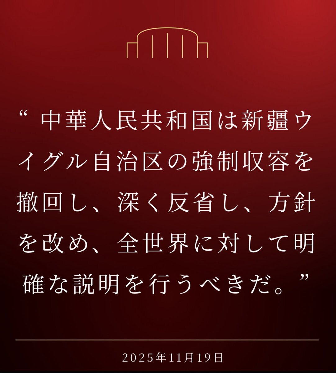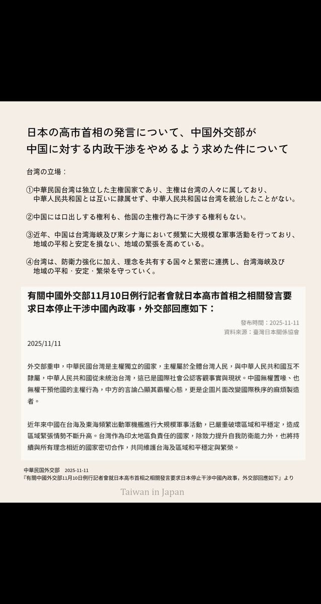 日本国内閣総理大臣高市早苗様 この度総理が台湾有事につき、存立危機事態、即ち集団的自衛権の行使状況に当たり得るとの見解を示されたことは、多くの台湾人の悲願とも言うべきものであり、我々の心を強く奮い立たせるものでした。