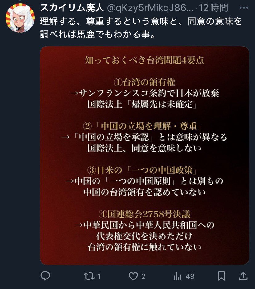 この人は「日本もアメリカも中国との国交回復以来、台湾は中国の一部であることを認めている」と仰ってますがそれは初耳です。私の理解では、日本もアメリカも中国との国交回復以来、台湾が中国の一部である事を認めた事は一度もありません。今日はヒマだからこの点についてちょっと検証してみましょう x.com/bSM2TC2coIKWrl…