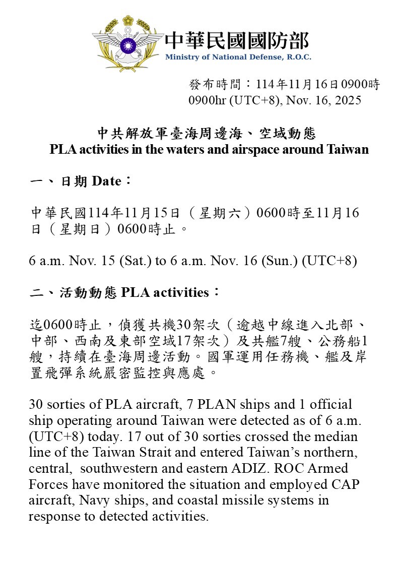 30 PLA aircraft, 7 PLAN vessels and 1 official ship operating around Taiwan were detected up until 6 a.m. (UTC+8) today. 17 sorties crossed the median line and entered Taiwan’s northern, central, southwestern and eastern ADIZ. We have monitored the situation and responded.