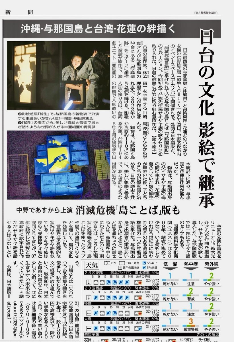 影絵芝居『鯨生~Geio~』いよいよ国内ツアー最終の地 中野公演です! 毎日新聞さんにご紹介いただきました。 日本語版はまだお席に余裕ございます! 2018asianrib.stage.corich.jp/stage/362719 #亜細亜の骨 #鯨生 #鈴木光介  #東盛あいか #久保恒雄 #与那国語 #消滅危機言語 #台湾原住民 #サキザヤ語 #サキザヤ族 pic.x.com/25w1lqeMys