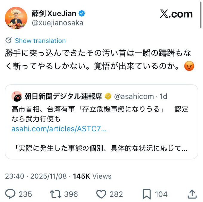 かなりマズイです 高市早苗首相(総理大臣)の 「台湾有事。台湾有事」発言 撤回しないらしい 女性初の総理大臣より #台湾有事発言 で 日本を終了させた首相になりたいらしい #高市やめろ pic.x.com/cjF9nrBEGJ x.com/nh3aibrS1cwuak…