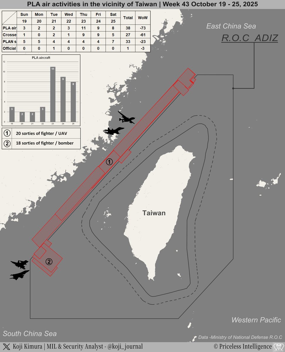先週の台湾における中国軍(PLA)🇨🇳の活動状況です。 すべての項目で大幅に減少しており、PLA東部戦区・CCG東海管区は総出で休暇を取っているのかと思える内容でした。 PLA air activities in the vicinity of Taiwan |Week 43 October 12-25, 2025 #TaiwanADIZ #TaiwanStrait #台湾有事 #台湾海峡 pic.x.com/kF7u3zemeu