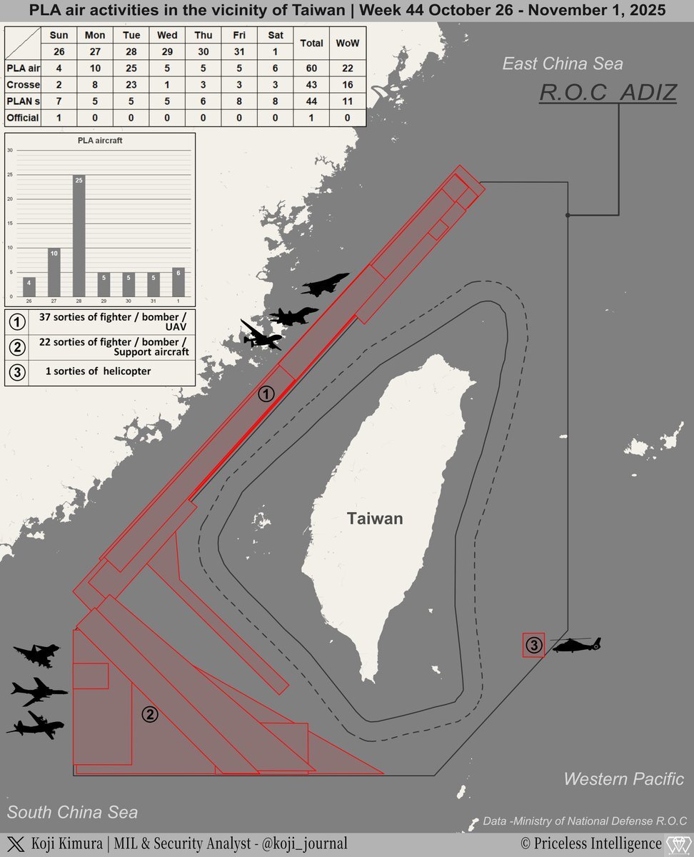 諸事情で遅くなりましたが、先週の台湾における中国軍(PLA)🇨🇳の活動状況です。 H-6の飛行は認識する程度で良いと思います。 PLA air activities in the vicinity of Taiwan |Week 44 October 26 - November 1, 2025 #TaiwanADIZ #TaiwanStrait #台湾有事 #台湾海峡 pic.x.com/4X66Pro8CN