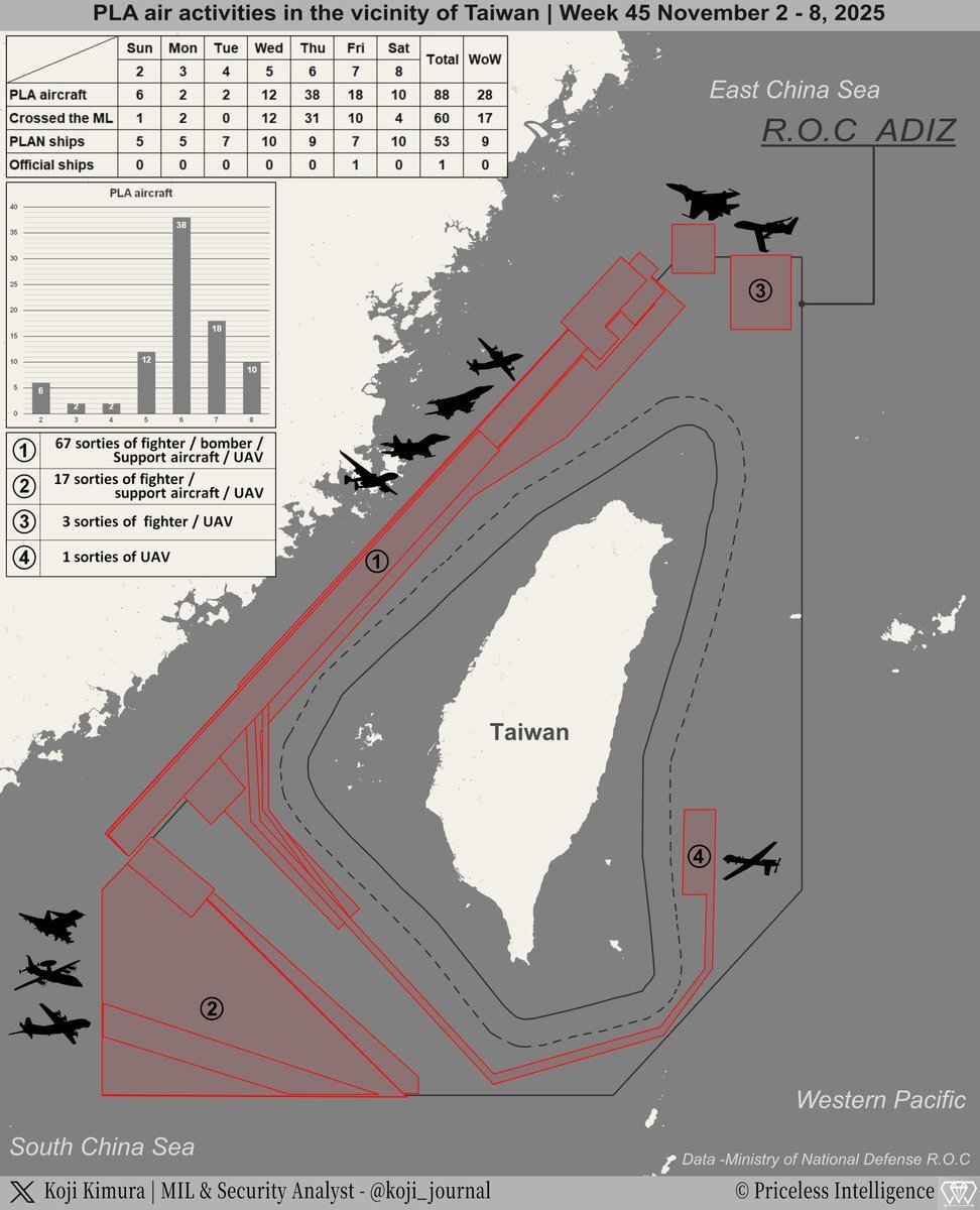 先週の台湾🇹🇼における中国軍(PLA)🇨🇳の活動状況です。 6日に38機の飛来が確認されました。30機越えは9月28日以来となります。海警局の活動は依然と小規模の状態です。 PLA air activities in the vicinity of Taiwan |Week 45 November 2-8, 2025 #TaiwanADIZ #TaiwanStrait #台湾有事 #台湾海峡 pic.x.com/lfOzpihaew