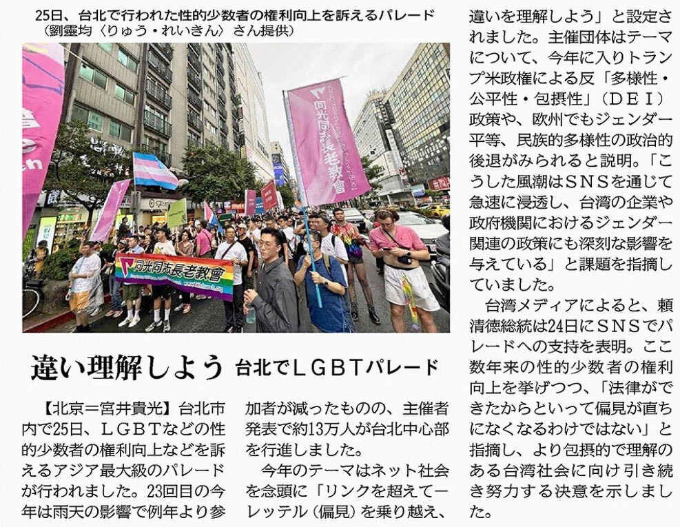 #しんぶん赤旗』2025.10.26.、6面。台湾の #プライドパレード の記事。写真に映ったのは台北市にあるLGBTQフレンドリーのキリスト教会「#同志同光長老教會」の皆様。#台灣同志遊行 #台湾プライドパレード #taiwanpride #LGBTQ pic.x.com/LMwnCppVpA