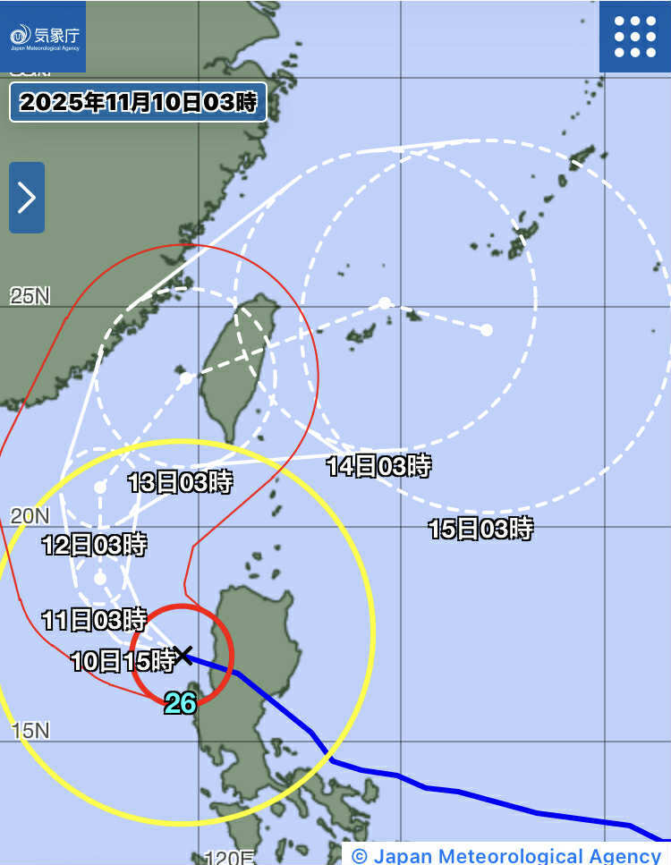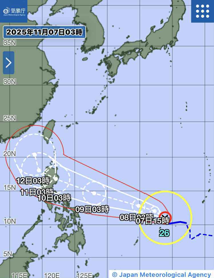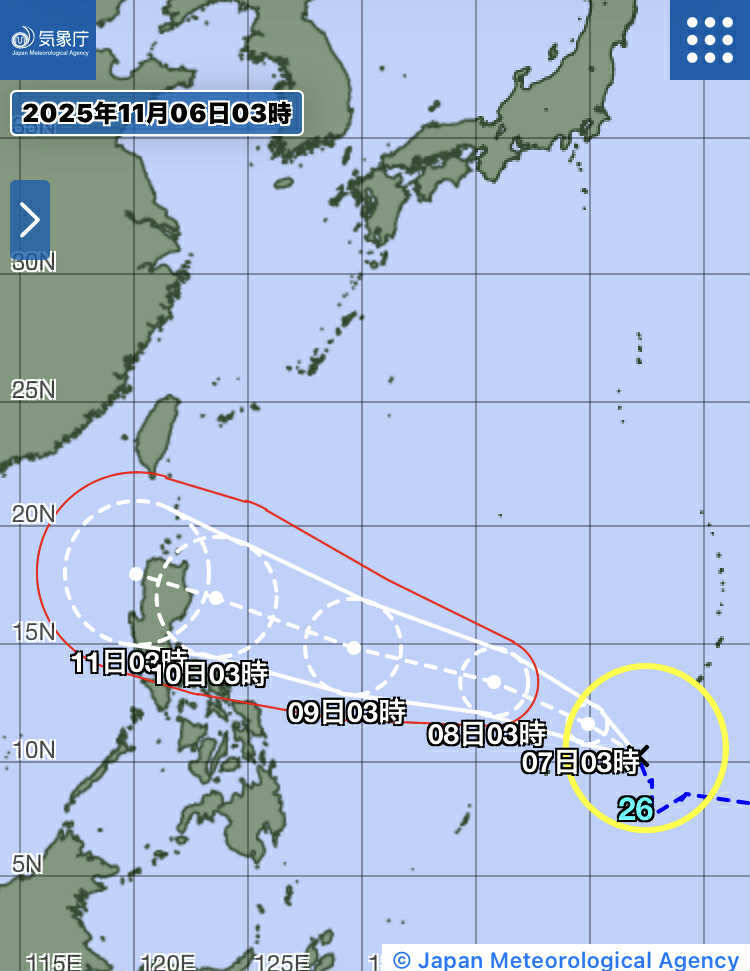 日時: 2025年11月6日 04時20分 (JST) 台風第26号 (フォンウォン) (Fung-wong) が発生しました 位置:10.2N 142.1E ソース:JMA jma.go.jp/bosai/map.html… #台風 #typhoon #cyclone #台風ログ #5ch #台風第26号 #台風26号 #26号 #フォンウォン #Fungwong