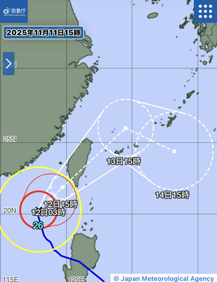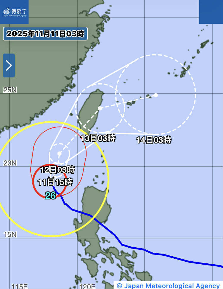 #台風26号 2025年11月11日03時50分発表 #6 #台風第26号(フォンウォン) 現在、南シナ海 北北西へ15km/hの速さで進行中 中心気圧:975hPa 中心付近の最大風速:30m/s 最大瞬間風速:45m/s FMうるまスタッフブログ ➡ fmuruma.com/e13030516.html #FMuruma #ゆいまーるラジオ #沖縄 #TY202526 #台風情報 pic.x.com/odqumrkqC1