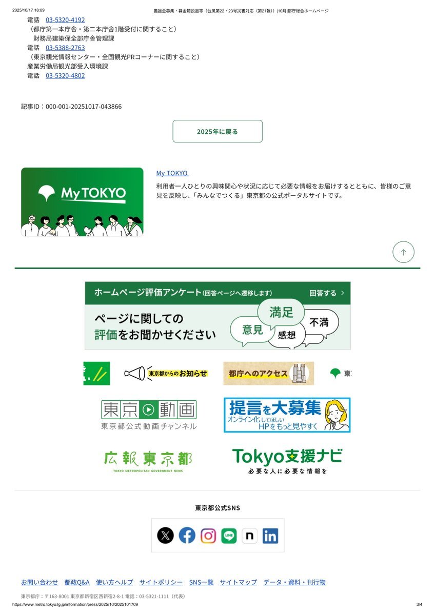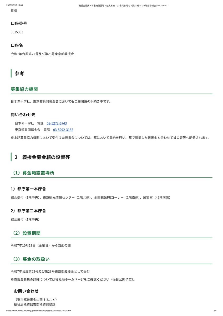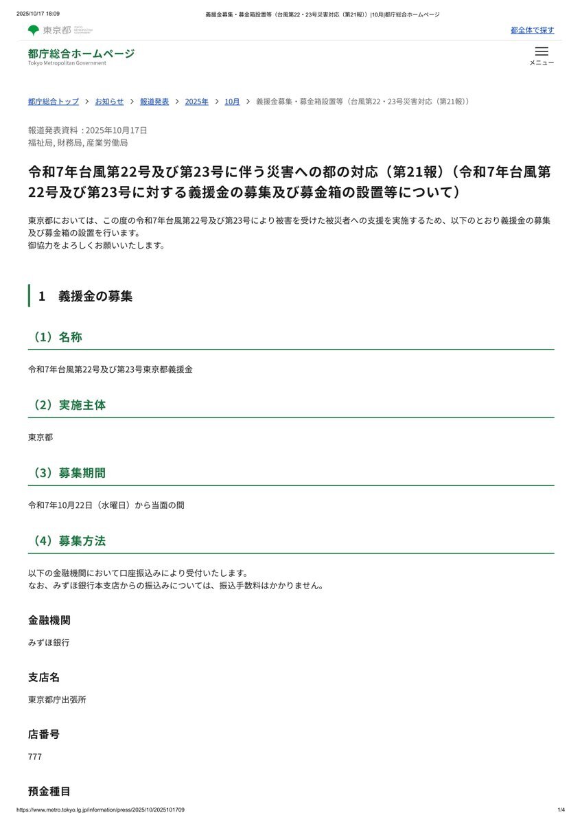 日本人のみなさん誰も信じてくれないんですけど 義援金て あつまったら 被災者の人数で割ると 家 建つんですょ 令和7年台風第22号及び第23号に伴う災害への都の対応 👉義援金の募集及び募金箱の設置等について ~10月17日(金)現在~ 東京都(都庁)より #台風22号 #台風23号 #八丈島 pic.x.com/uDhsL33ECc
