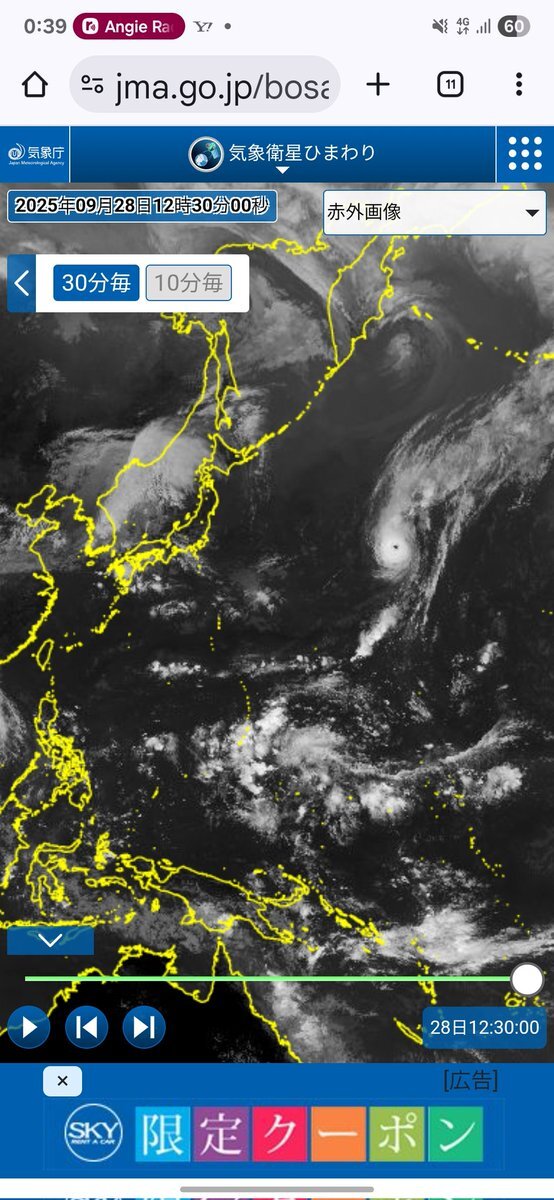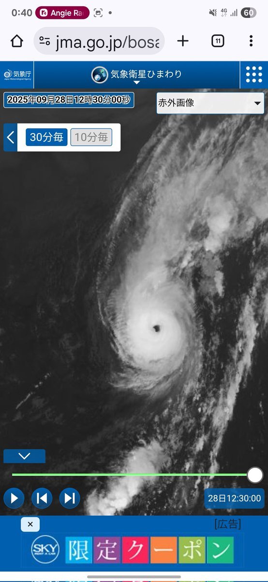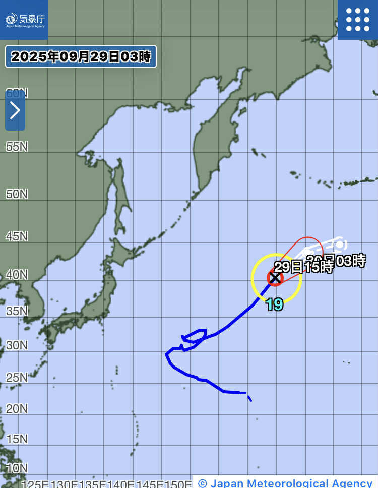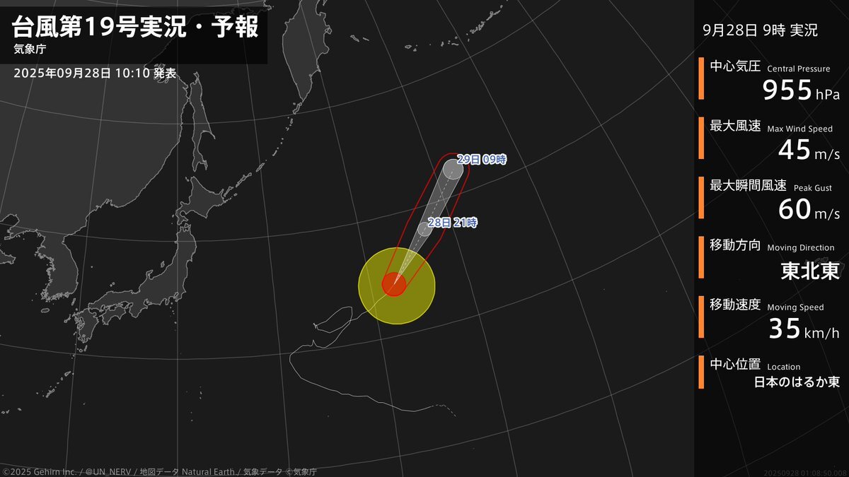 #台風19号 2025年09月29日04時10分発表 #11 #台風第19号(ノグリー) 現在、日本のはるか東 北東へ60km/hの速さで進行中 中心気圧:960hPa 中心付近の最大風速:40m/s 最大瞬間風速:60m/s FMうるまスタッフブログ ➡ fmuruma.com/e13011766.html #FMuruma #ゆいまーるラジオ #沖縄 #TY202519 #台風情報 pic.x.com/uf3CRUUP9p