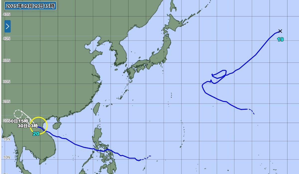 散々迷走した #台風19号 は今朝29日9時に温帯低気圧になりました。改めて軌跡を見ると、偏西風に乗れるまで苦労したんだな…としみじみしますね。一方、台風20号は27~28日にかけて南シナ海で再発達してから29日未明にベトナムに上陸し、現地は荒れた天気になっているようです。 pic.x.com/tFQQaIg10w