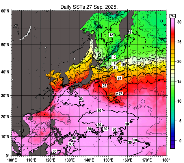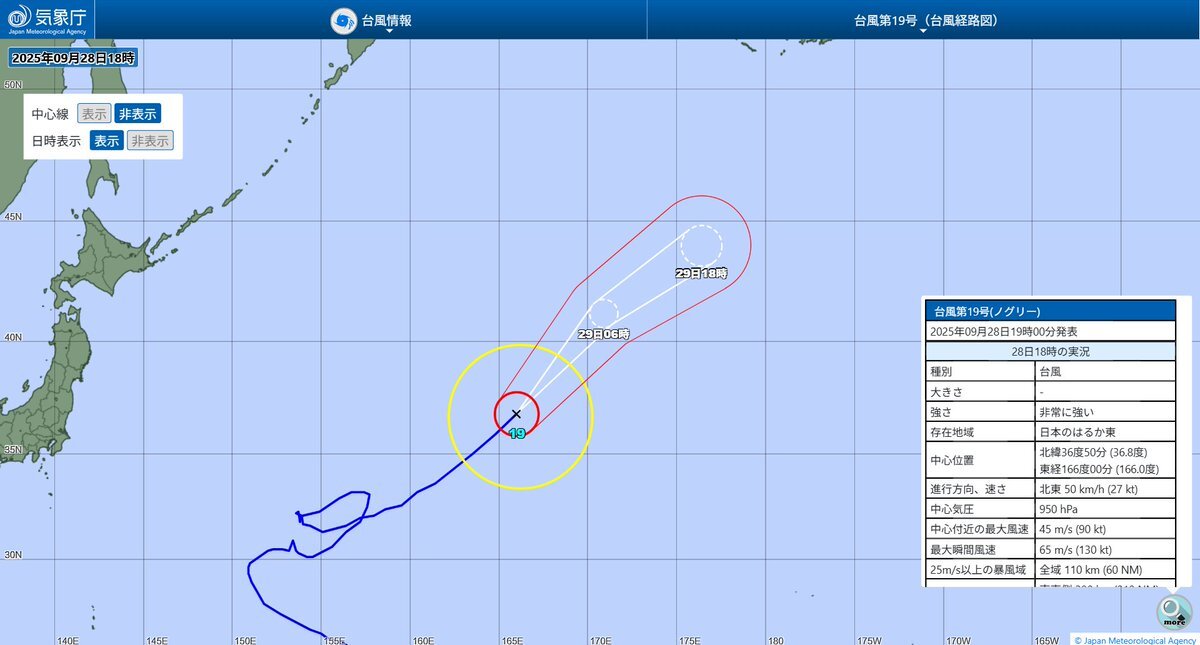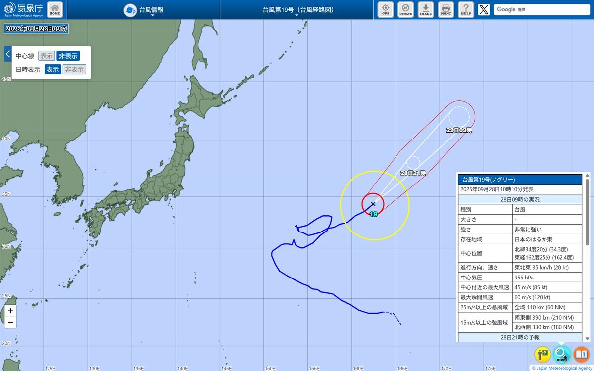 🌪️ 今Xで #台風19号 がトレンドやけど、 2025年9/30 11:27 AM JST現在、 日本のはるか東の海上を 時速15〜20kmで東北東 に進行中。 中心気圧は 985hPa、最大風速 30m/s の「強い」勢力。 直撃の恐れは低いけど、太平洋側は 🌊 高波注意報だらけ! 東北〜九州の沿岸は、うねりで 波5m超え pic.x.com/kgaQ2uac0d